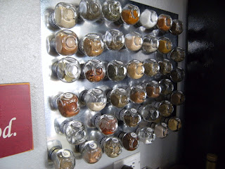 their tops, filled with colorful spices, and neatly stuck to a wall mounted